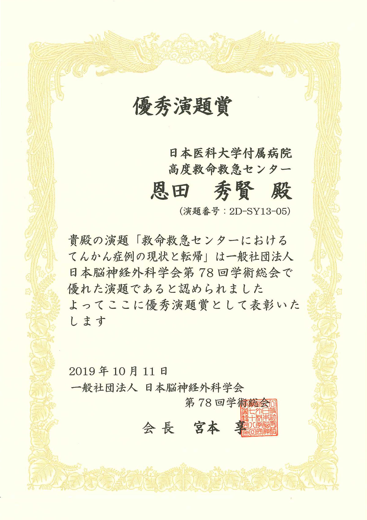 当科 恩田秀賢医師が感謝状を授与いたしました。